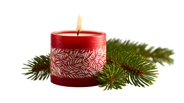 Red burning candles with ribbons and gold ornaments glow beside a decorated Christmas tree for a festive December holiday celebration