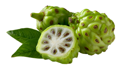 Close up of a whole and sliced noni fruit with green leaves isolated on transparent background