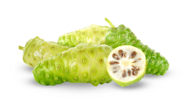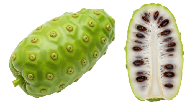 fresh green noni fruits with a cross-section revealing their unique interior.