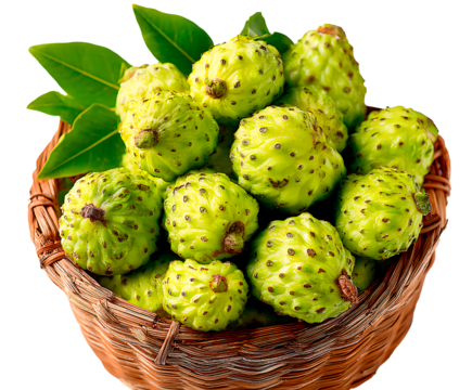 A basket filled with fresh green noni fruits and leaves, displayed against a transparent background.