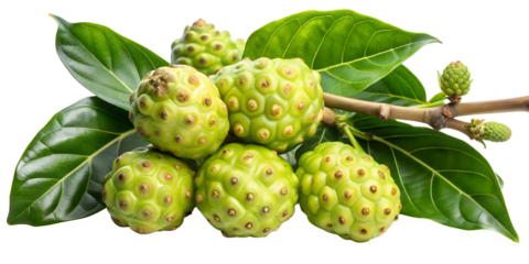 Noni fruits isolated on transparent background, showcasing its bumpy texture and vibrant green color, surrounded by lush green leaves and a sturdy branch, highlighting its natural beauty