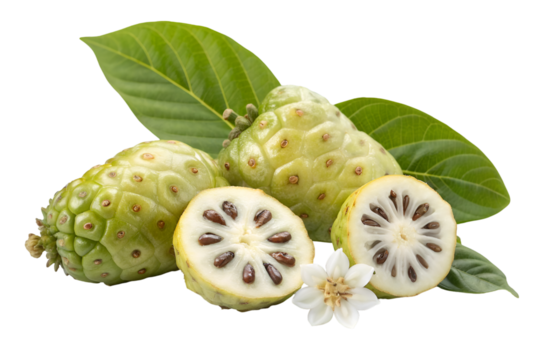 Whole and sliced noni fruit isolated on transparent background