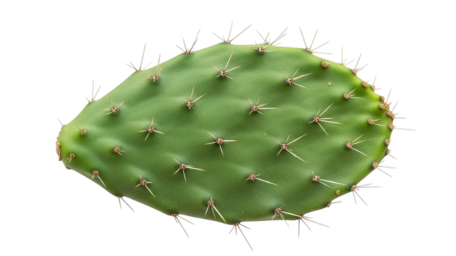 Sliced prickly pear cactus pad isolated PNG, vibrant green nopal cactus leaf with spines on transparent background, healthy food ingredient