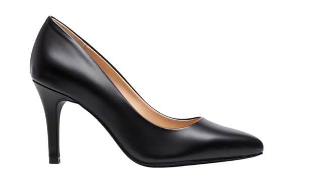 Black kitten heels with pointed toe and sleek design, isolated, transparent background, no background