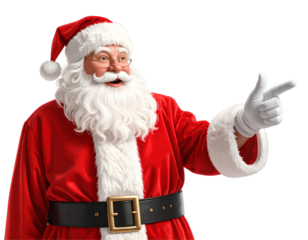 Cartoon illustration of Santa Claus (Father Christmas) cheerfully pointing forward, isolated on transparent background, PNG