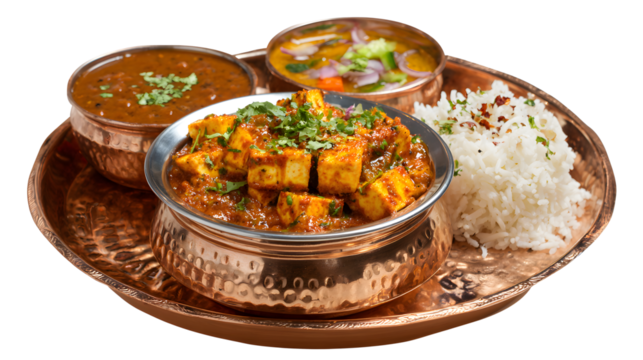 Traditional Thali Food Kadai Paneer Served With Dal Makhani isolated on a white background