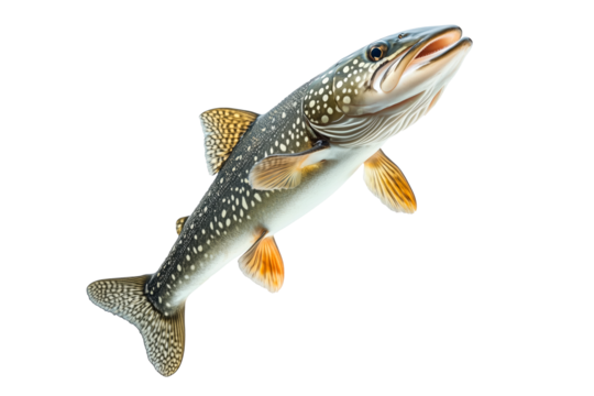 Detailed northern pike fish with spotted scales, fins and sharp jaw isolated on white transparent background, concept of aquatic life