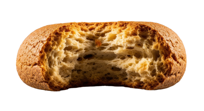 Extreme macro of thick, golden-brown norwegian knekkebrød, dramatically torn, revealing porous interior, splintered edges, crumbs. isolated on transparent with shadow, intense raking light, sharp