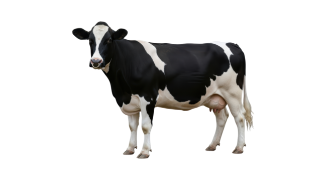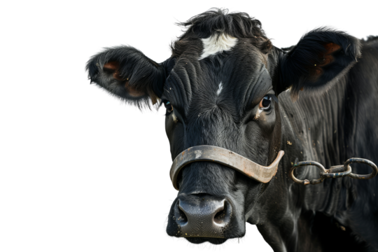 Close-up of a black and white cow looking at the camera, isolated on a white background, wearing a nose ring and harness.