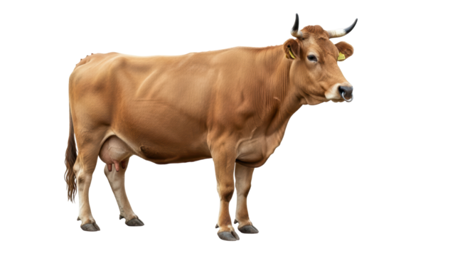 Isolated cow profile standing with horns and a nose ring in full shot on seamless field