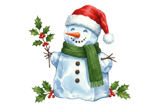 Highly detailed vintage watercolor illustration of a translucent blue-white ice snowman, wearing a red velvet hat and green wool scarf, holding holly and berries on a white background with copy
