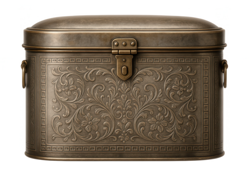 Vintage-style tin document container with decorative embossing, suitable for a retro-themed study.
