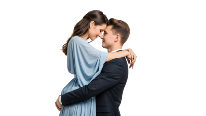 Elegant couple shares a tender embrace with loving smiles and foreheads touching portraying deep affection and romantic connection in a beautiful heartfelt moment