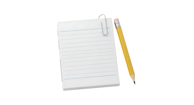 A stack of lined notepaper held by a paperclip sits next to a yellow pencil on a white background.