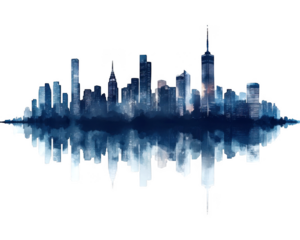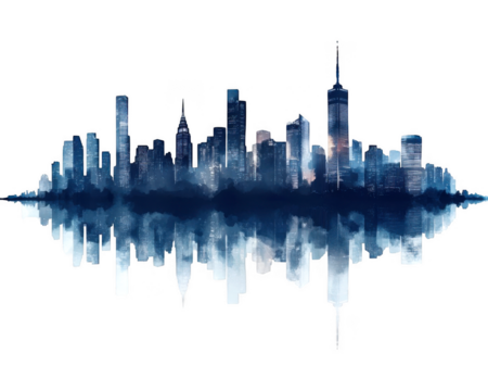 Watercolor reflects the glowing cityscape with notable skyscrapers on transparent background