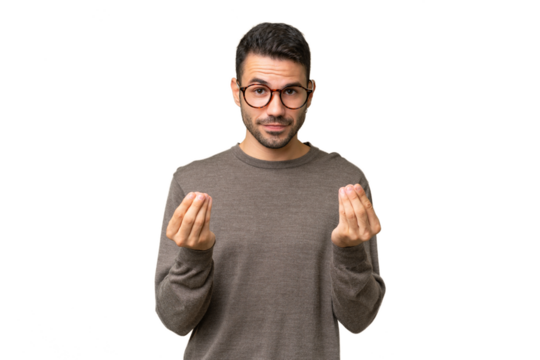 Young handsome caucasian man over isolated background making money gesture but is ruined