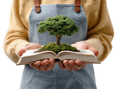 Nurturing Knowledge: A person lovingly cradles an open book, a symbol of education, on which a miniature tree flourishes, symbolizing the growth of wisdom, knowledge.