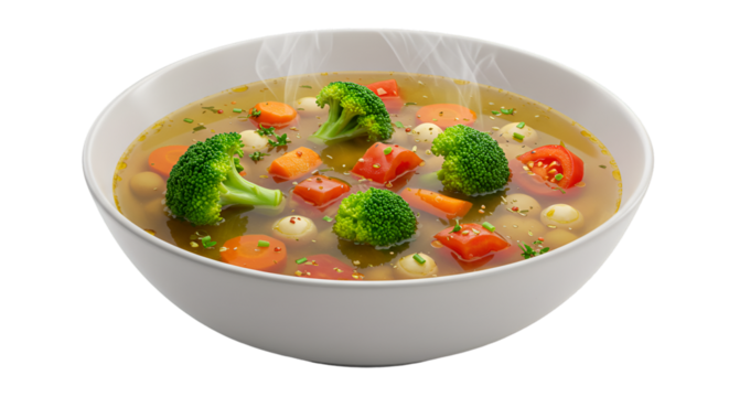 Floating soup bowl with simple ingredients on transparent background