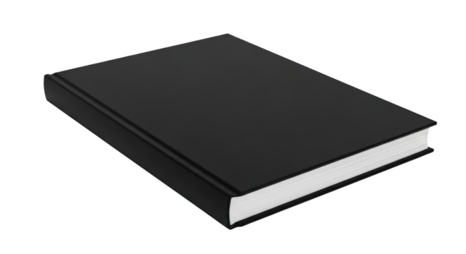 Hardcover book with white pages presented at an angle isolated on transparent background