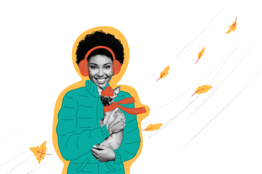 Composite photo collage of happy american girl hold puppy animal autumn walk windy weather leaves season isolated on painted background