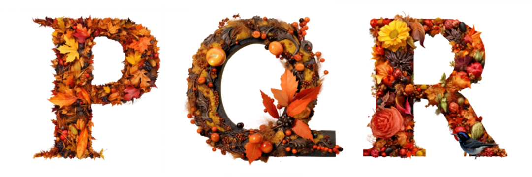 Autumn P, Q, R letters font isolated on transparent background - Generative AI