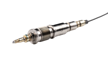 Close-up of a metallic precision instrument with a tapered design, featuring a small nozzle tip, multiple components, and a cable connector