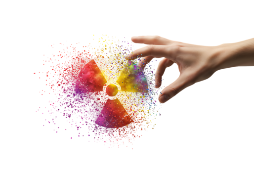 Hand reaching for colorful radiation symbol disintegrating into particles on white, representing the fading dangers of nuclear energy with a hopeful and innovative theme.