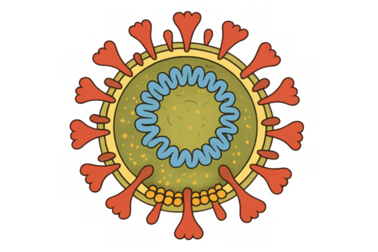 Coronavirus covid virus or germ with spike proteins and rna structure showing global pandemic and microbiology research