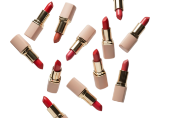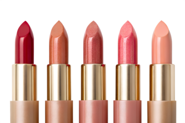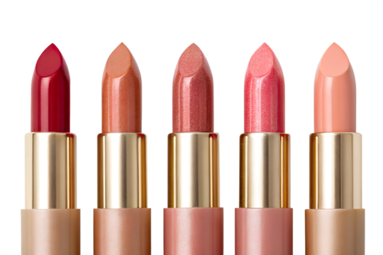 A vibrant collection of five lipsticks in red, pink, and nude tones are displayed against an isolated transparent background