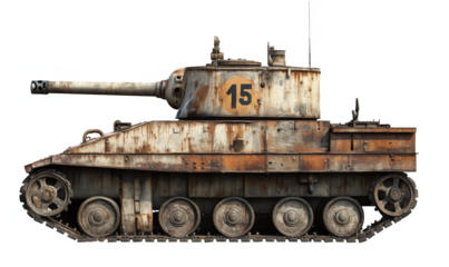 Rusty tank with number 15, weathered metal surface, visible tracks, military vehicle, side view, isolated on transparent background, png