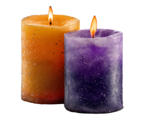 Set of two purple candles with melting wax and glowing flames isolated on transparent background