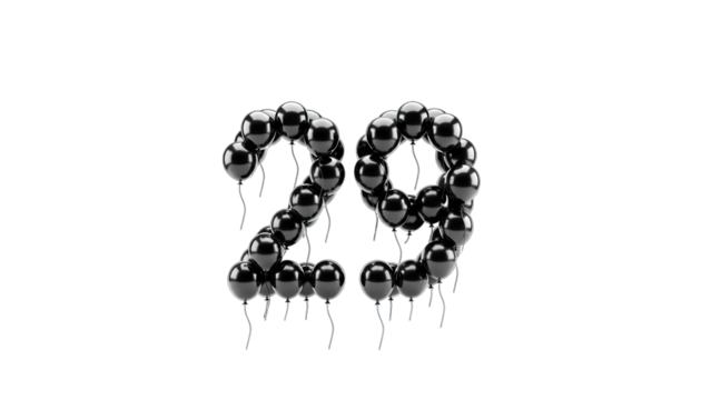 3D Number 29 made of black balloons on transparent background