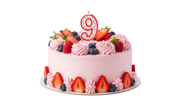 Delicious berry birthday cake with number 9 candle on transparent background PNG (9 नंबर का बेरी वाला केक)