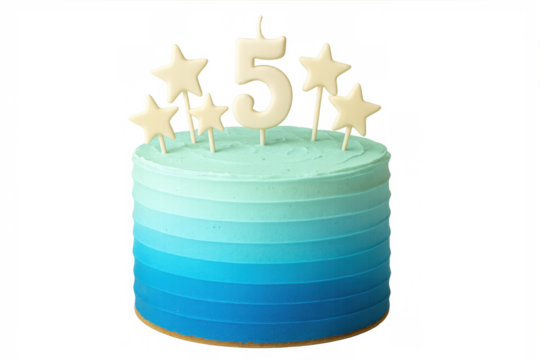 Celebrating five years, a blue ombre birthday cake with number five candle and star toppers for a child's party