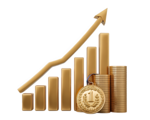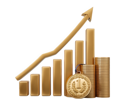 Gold bar chart upward arrow gold medal coin stack ranking success finance achievement business growth wealth