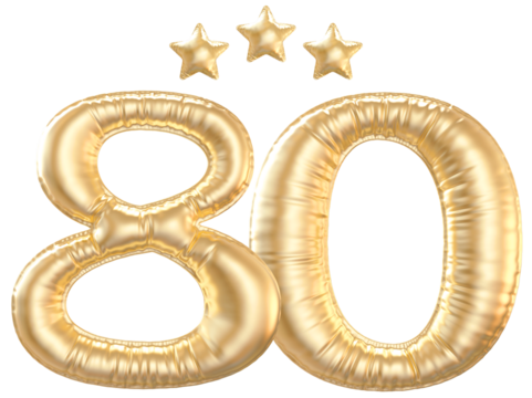 Number 80 Golden Foil Balloon Floating with Invisible Strings, Top-Down Perspective, Isolated