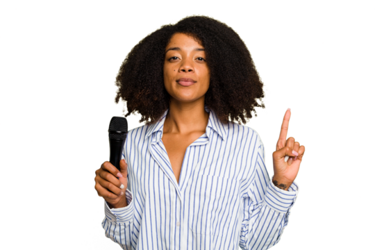 Young African American singer woman holding a microphone isolated showing number one with finger.