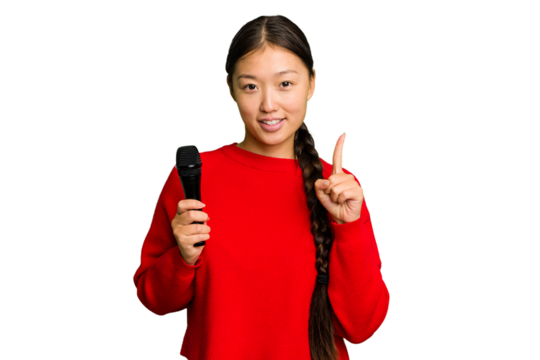 Young Chinese singer woman isolated showing number one with finger.