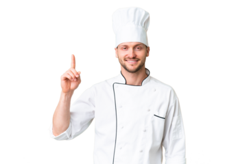 Young caucasian chef over isolated chroma key background showing and lifting a finger in sign of the best