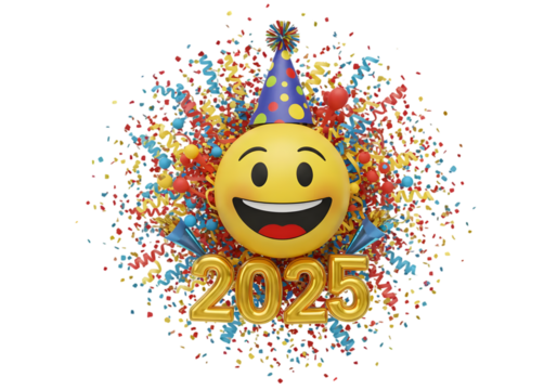 Festive celebration graphic with emoji, colorful explosions, party hat, New Year 2025, vibrant confetti, cheerful atmosphere, joyful imagery