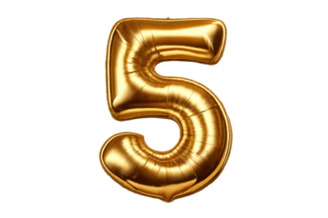 Shiny gold foil balloon in the shape of the number five for birthday or anniversary milestone