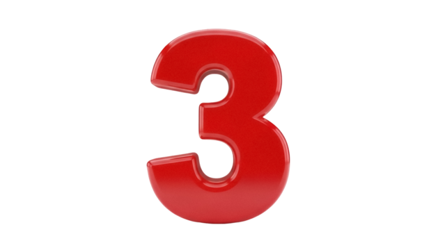 Shiny red number three isolated PNG on transparent background, 3D rendering of numeral for graphic design and educational use