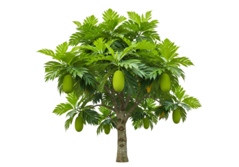 Lush green breadfruit tree with vibrant foliage and numerous fruits against a striking black backdrop.