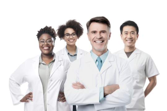 Smiling diverse group of professionals and casual individuals, against transparent studio background with reflective floor Concept of a modern, inclusive workforce