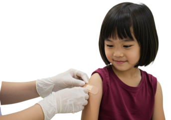 Young Asian girl (6-7) with bob hair, maroon t-shirt, calm smile, watches as gloved hands gently apply a bandage to her arm in a sterile medical room with copy space, childhood healthcare trust