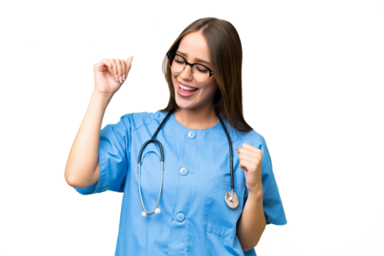Nurse showing sign billboard blank with copy space. Woman medical professional in scrubs wearing stethoscope smiling friendly isolated cutout PNG on transparent background.