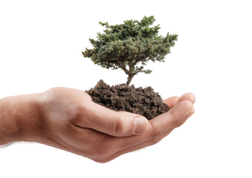 A hand cradles a miniature tree with soil, emphasizing growth and nurturing