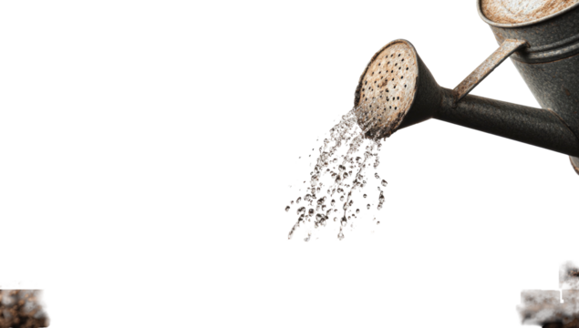 Close-up of metal watering can pouring water onto dark soil. Background is solid black