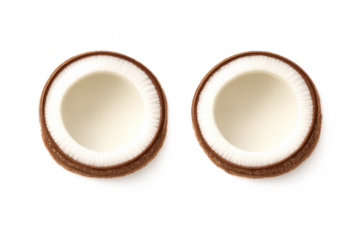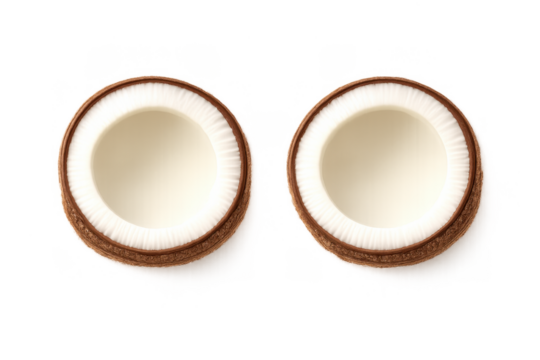 Coconuts halves showing white meat and brown shell, tropical fruit nutrient rich food, transparent background