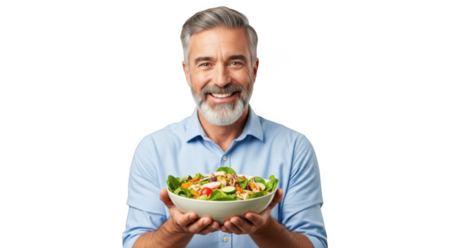 Smiling mature man holding a fresh healthy salad bowl full of nutrients and goodness